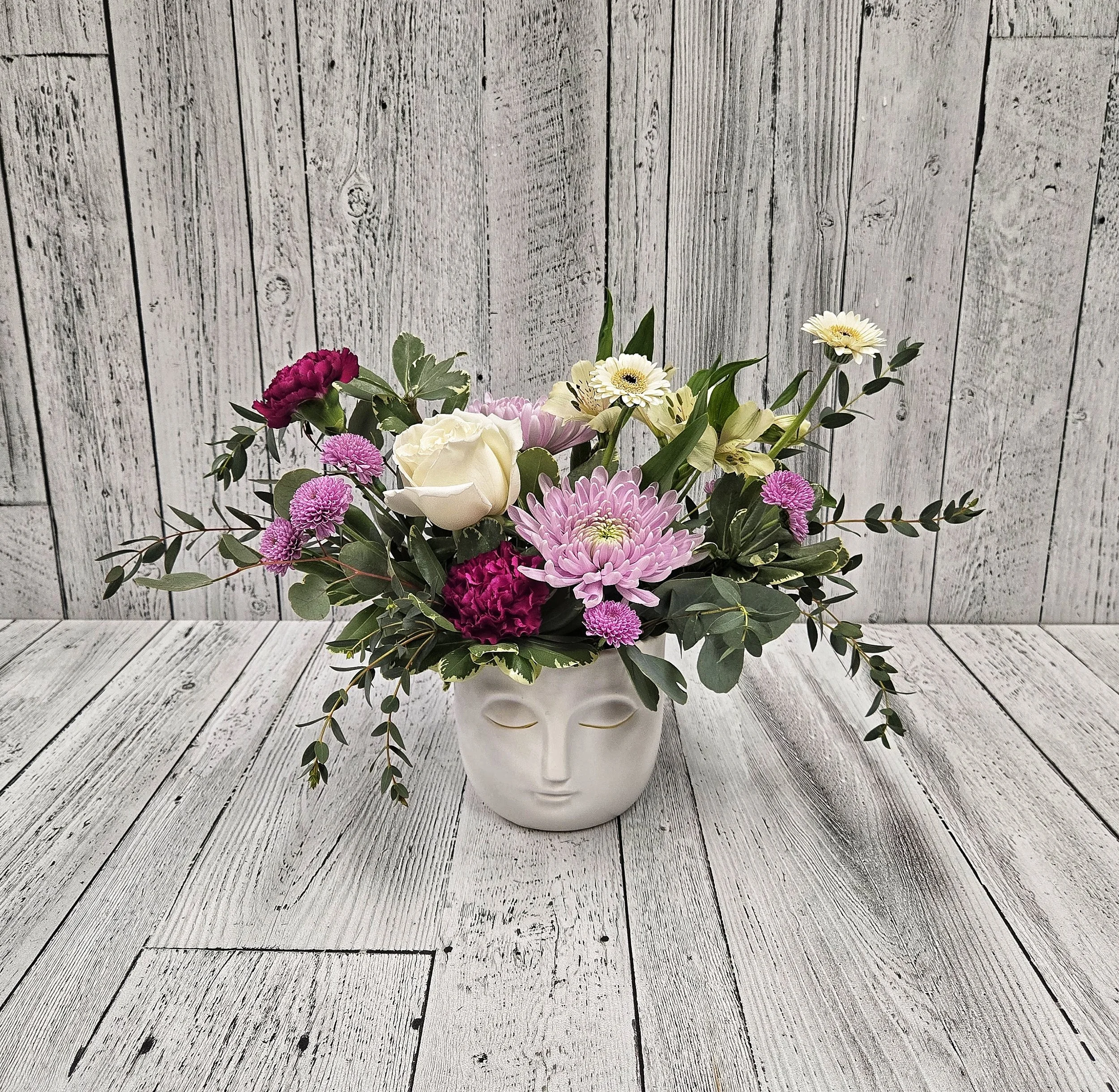 From Happy birthday, thinking of you or just because. Using long lasting flowers such as carnations, alstroemeria, roses and other seasonal flowers.